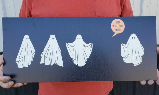 Ghost Ghostie Humor Always Late Halloween Joke Home decor Fall Autumn Spooky Goofy Printed on wood Shelfsitter