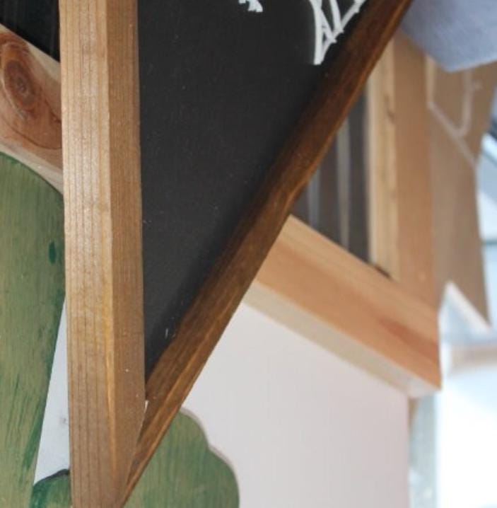 It has laser cut plywood letters and graphics. All components can be customized for an additional fee. This sign is framed with a brown stain, has a black painted backerboard, and raised image.