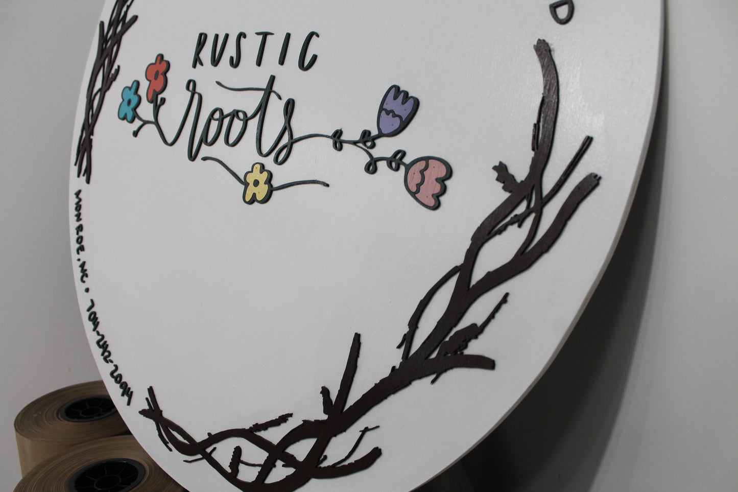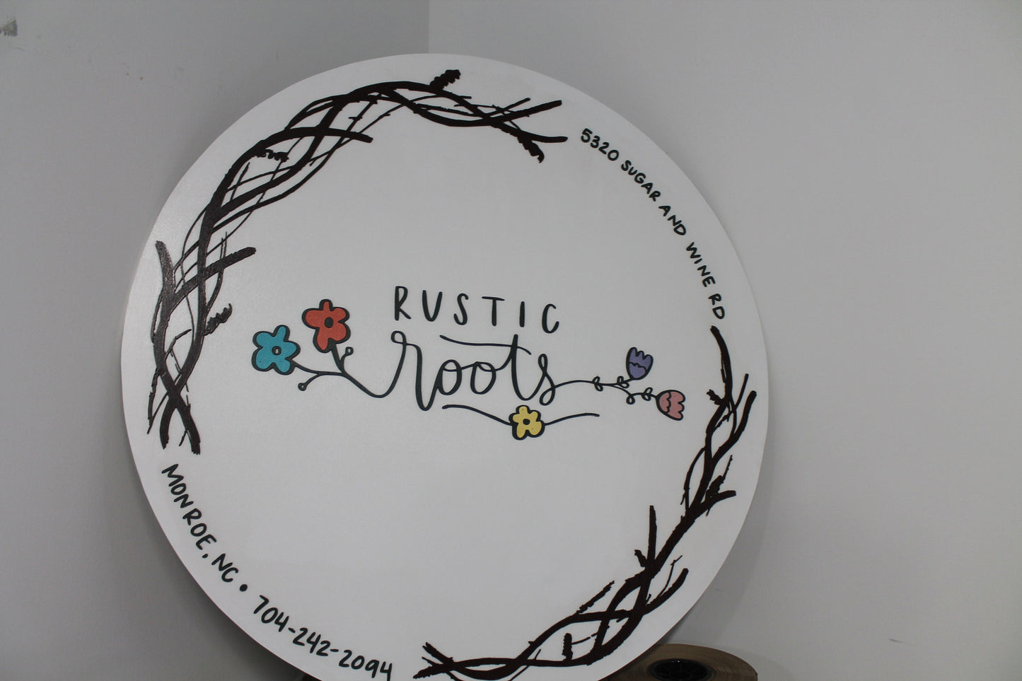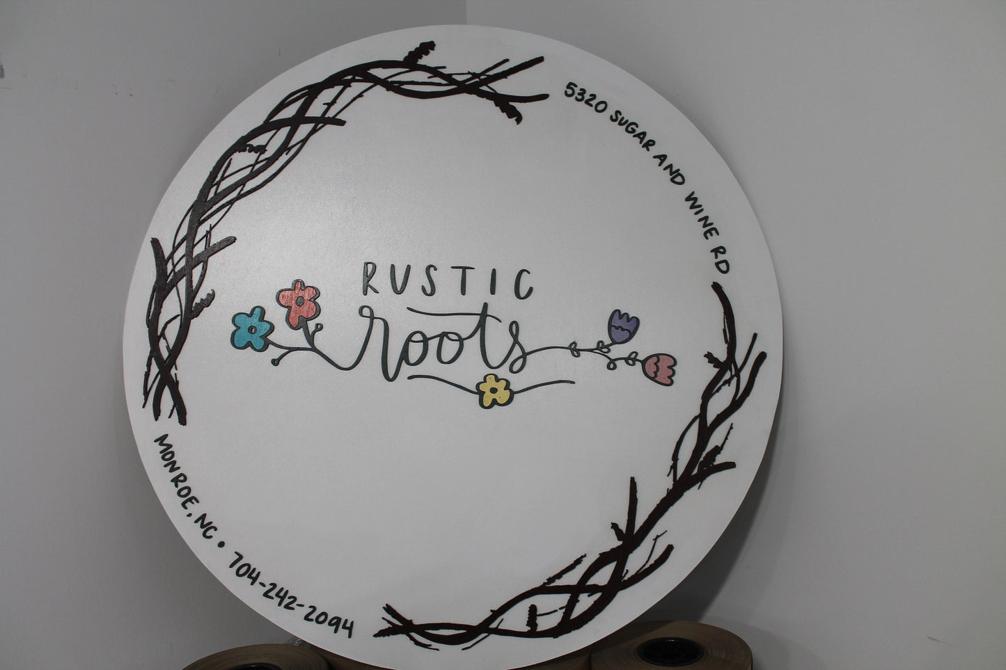 Custom Business Sign Round Rustic Roots Floral Hoop Branches Trees Made to Order Logo Circle Wooden Handmade Raised Text Home