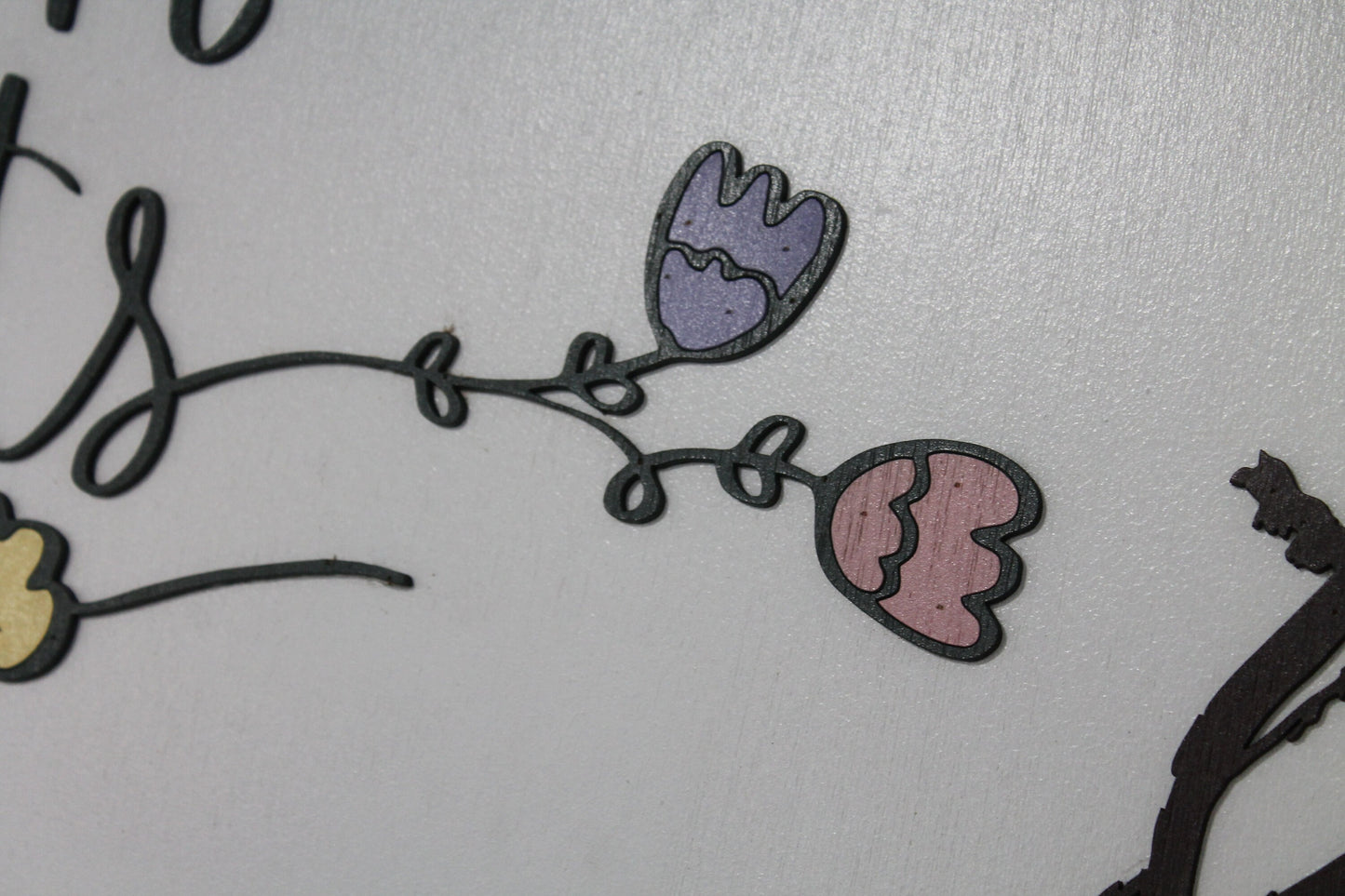 It has laser cut plywood letters and graphics. Your custom sign will NOT come standard with these graphics or lettering. All components can be customized. This sign is unframed, white painted backerboard, and black painted letters.