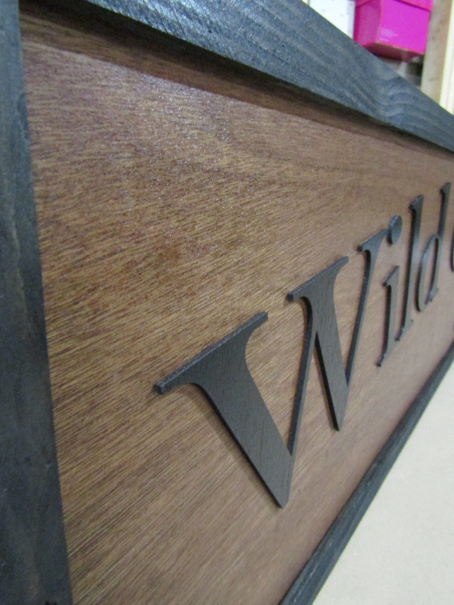 It has laser cut plywood letters and graphics. Your custom sign will NOT come standard with these graphics or lettering. All components can be customized. This sign has a solid wood frame stained ebony, medium brown stained backerboard, and black painted letters.