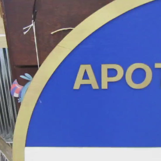It has laser cut plywood letters and graphics. Your custom sign will NOT come standard with these graphics or lettering. All components can be customized. This sign is unframed, has a blue painted backerboard, and gold embellishments..