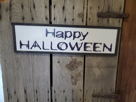 Handmade Happy Halloween Wood Sign: Purple Spiderweb Lettering