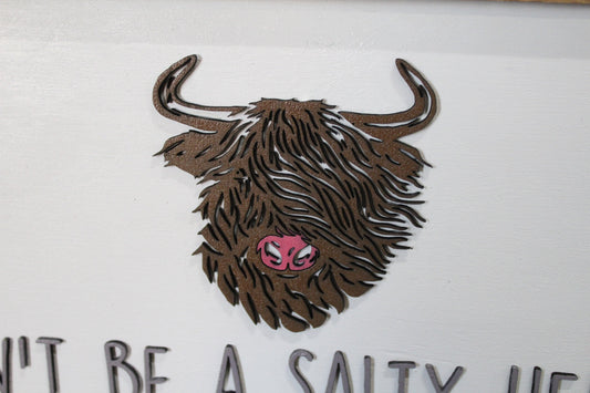Don't be a Salty Heifer Cow Wood Sign Highland 3D Raised Text Image Long Hair Fuzzy Scottish Cow Farmhouse Handmade Sign Rustic Primitive