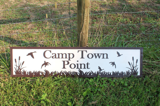 Camp Wood Sign Cabin Entrance Black White Customizable name Rustic birds trees grass driveway campground rustic handmade Raised 3D Lettering