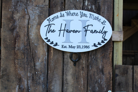 Custom Monogram Last Name Sign Wood Oval Personalized Family Wedding Gift Established Date Home is Where You Make It Raised 3D Script Laurel