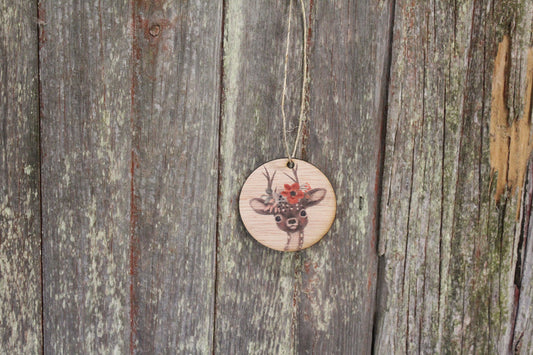 Christmas Deer Floral Wreath Headpiece Ornament Baby Fawn Winter Flowers Face Ears Spots Wall Hanging Tree Rustic Farmhouse Wood