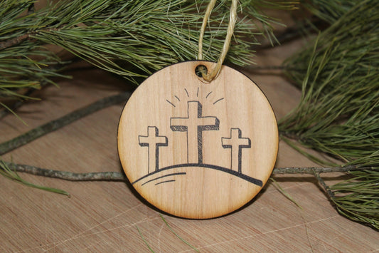 Risen Three Crosses Ornament Wood Slice Cross on the Hill Jesus Second Coming Easter Christmas Tree Primitive Rustic Religious Farmhouse