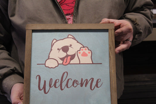 American Eskimo Welcome Wood Sign Fluffy Waving Dog Samoyed Puppy Print Wall Art Decoration Wall Hanging Farmhouse Rustic Framed
