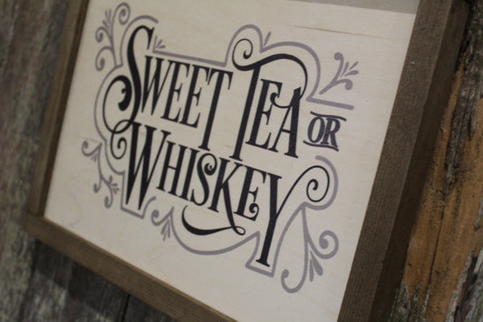 Sweet Tea or Whiskey Wood Sign Farmhouse Wall Decor Picture Print Primitive Rustic Barn Wood Script Text Kitchen Porch Sign Wood Frame