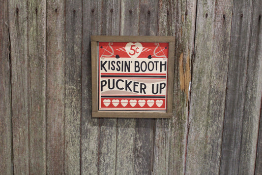 Kissin' Booth Wood Sign Pucker Up Valentines Day Hearts Red Love Kissing Brown Framed Print Wall Art Farmhouse Primitive Rustic Cupids Arrow